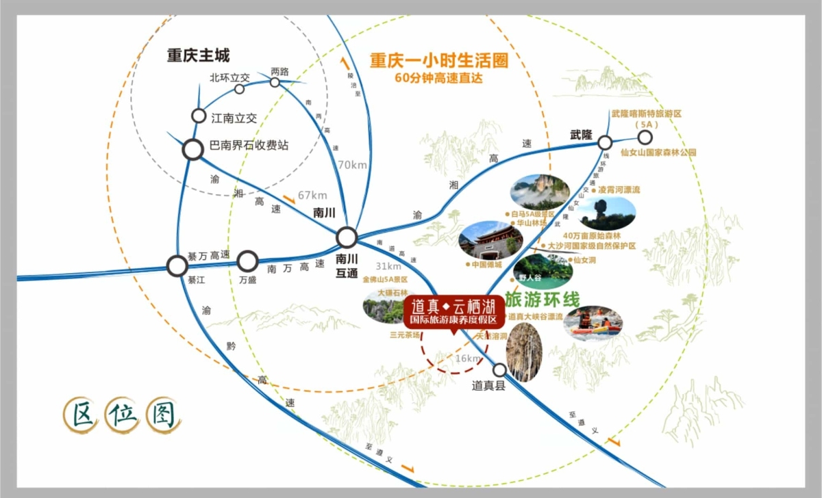 ★ 距離、交通優(yōu)勢:距離近,路況好,交通便捷 道真·云棲湖國際旅游康養(yǎng)度假區(qū)位于全域康養(yǎng)森林示范城市——道真最北端,重慶主城以南108公里,毗鄰重慶南川,眺望金佛山、山王坪,地處渝黔之交,融入“重慶一小時生活圏”范圍之內。 【高速】(包茂、南兩高速):項目距重慶主城108公里,80分鐘高速車程,下道5分鐘即到達項目,是重慶周邊少有的全高速直達避暑康養(yǎng)度假項目,主城過來在巴南界石上高速走包茂高速,途徑南川上銀百高速至儺城出口再行駛6公里,5分鐘即可到達項目,總耗時85-90分鐘左右。 【高鐵】2025年3月渝湘高鐵開通后從重慶主城區(qū)至南川僅需15分鐘,南川至項目僅需30分鐘車程,全程45分鐘即可到達項目,交通非常便捷,出行方式多樣豐富。 【大巴直達】在龍頭寺和菜園壩有城際大巴(政府交運)直達云棲湖商業(yè)中心公交站,真正的大巴直達小區(qū),每天兩班,全年運行,不分淡旺季,票價65元。 【公交進小區(qū)】政府配套的11路公交站,在云棲湖設站(商業(yè)中心處),從道真-云棲湖-大磏-儺城,每半小時一班,全年運營,云棲湖-道真:25分鐘;云棲湖-大磏:10分鐘;云棲湖-儺城:15分鐘;業(yè)主去縣城,場鎮(zhèn),景區(qū)都很方便。 |